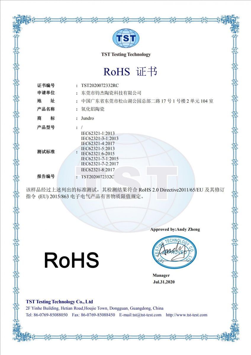 鈞杰陶瓷是一家專業從事氧化鋁陶瓷生產及加工的企業,我們十分注重產品品質,無論是加工精度還是環保要求,我們都嚴格把關。目前我們的氧化鋁陶瓷已通過ROHS認證。