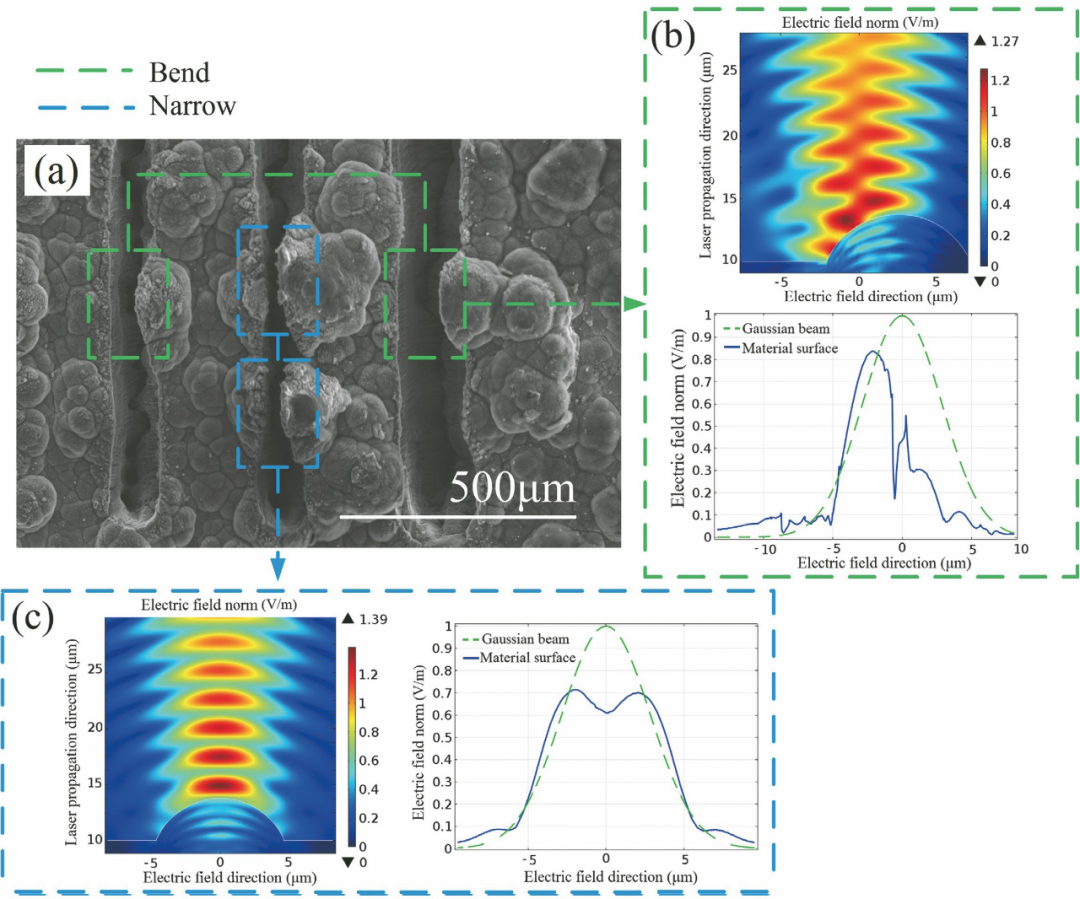 CMC-SiC主要由最外側(cè)的SiC層和內(nèi)部的SiC基體、纖維及界面層組成,在纖維編織結(jié)構(gòu)中還包含許多微小孔隙,復(fù)雜的材料結(jié)構(gòu)致使CMC-SiC在激光加工過程中會(huì)產(chǎn)生與一般均質(zhì)材料不同的物理和化學(xué)變化。在纖維增強(qiáng)復(fù)合材料與激光相互作用機(jī)理方面,國內(nèi)外學(xué)者基于理論與實(shí)驗(yàn)進(jìn)行了大量探索。吳恩啟等理論研究了碳纖維增強(qiáng)復(fù)合材料的熱傳導(dǎo)規(guī)律,推導(dǎo)出了復(fù)合材料內(nèi)部纖維束平面內(nèi)熱擴(kuò)散系數(shù)與相位梯度的關(guān)系。纖維編織復(fù)合材料具有各向異性的特點(diǎn),纖維束方向會(huì)直接影響熱傳導(dǎo)規(guī)律,且復(fù)合材料的熱擴(kuò)散系數(shù)與編織方式和基體材料分布相關(guān)。Allheily等研究了高能量激光對(duì)碳纖維增強(qiáng)復(fù)合材料的燒蝕機(jī)制,發(fā)現(xiàn)碳纖維增強(qiáng)復(fù)合材料對(duì)激光輻照產(chǎn)生的熱量具有很強(qiáng)的隔絕作用,主要原因在于碳纖維能夠承載并吸收熱量,層間基體材料的燒蝕可以有效降低激光能量的積累。Zhai等使用波動(dòng)光學(xué)仿真軟件分析了C/SiC原始表面粗糙度對(duì)激光加工效果的影響,仿真結(jié)果表明C/SiC原始表面形貌對(duì)激光刻蝕效果有顯著影響,激光輻照在C/SiC表面凸起的不同位置時(shí),電場會(huì)發(fā)生偏移或減弱,電場強(qiáng)度的不均勻分布導(dǎo)致C/SiC表面不同區(qū)域的刻蝕形貌存在差異,如圖2所示。
