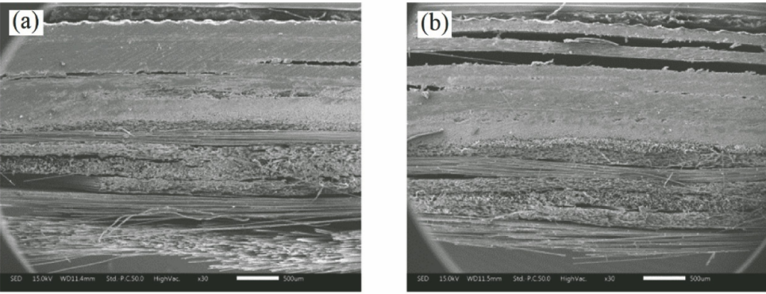 圖4 不同功率激光導(dǎo)致的層間開裂:(a) 500 W;(b) 1000 W