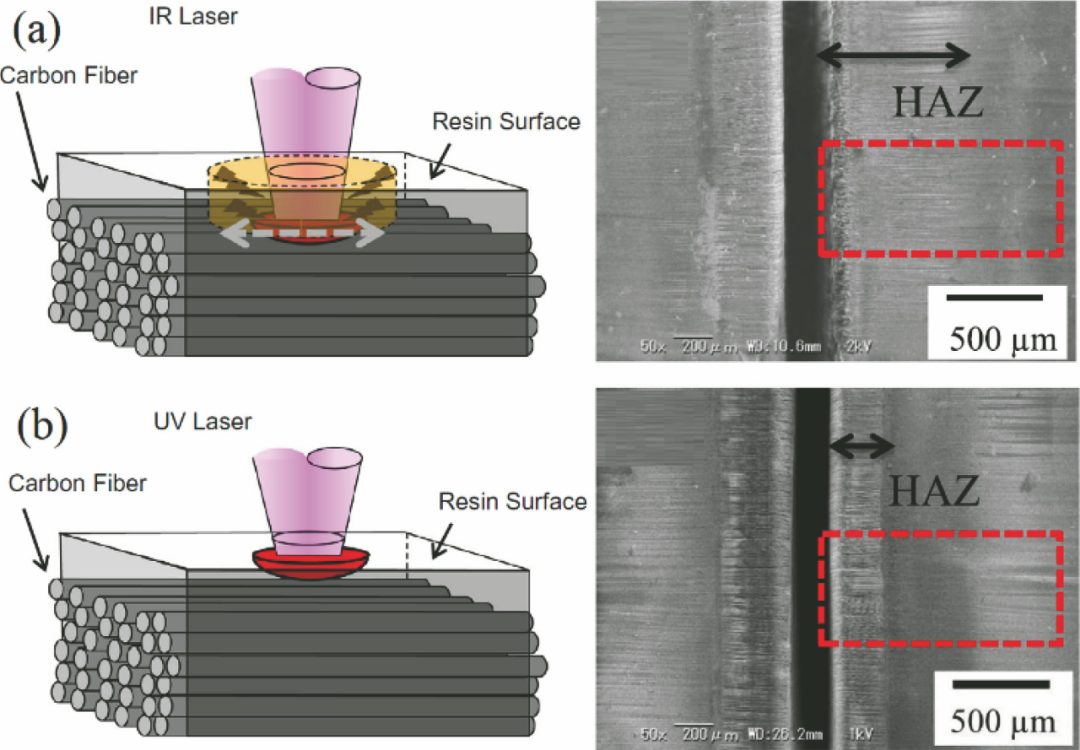 圖3 不同波長激光對(duì)纖維增強(qiáng)材料的作用效果對(duì)比:(a)紅外激光;(b)紫外激光