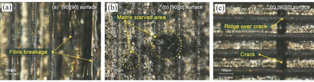CMC-SiC由多層纖維編織而成,在激光加工中會(huì)產(chǎn)生與一般均質(zhì)材料不同的缺陷。Wu等利用脈沖激光對(duì)C/SiC進(jìn)行了沿垂直纖維、平行纖維、纖維中軸三種掃描方向的加工實(shí)驗(yàn),在加工參數(shù)相同的前提下,掃描方向不同得到的微結(jié)構(gòu)形貌尺寸不同,并且在微結(jié)構(gòu)中發(fā)現(xiàn)了纖維斷裂、基體缺失及微裂紋等加工缺陷,如圖6所示。Hejjaji等在碳纖維增強(qiáng)復(fù)合材料的激光打孔過程中也發(fā)現(xiàn)了明顯的基體缺失,造成這種現(xiàn)象的原因是碳纖維具有較高的熱傳導(dǎo)率,在激光輻照過程中材料吸收的熱量沿纖維傳導(dǎo)至基體材料,大量的熱吸收導(dǎo)致基體材料被燒蝕。同時(shí),加工區(qū)域邊緣基體材料缺失導(dǎo)致的纖維外露現(xiàn)象尤為明顯。