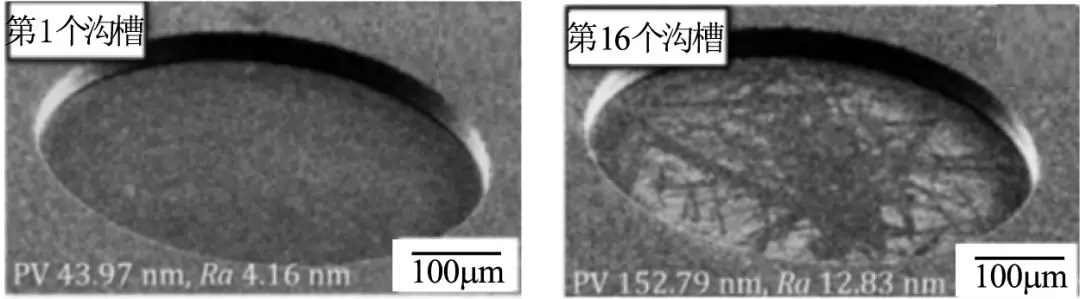 切削過程中,切削區域的高溫高壓環境極易引起SiC材料發生氧化,并粘附在刀具表面,嚴重影響加工表面質量。Z.P. Li等使用多晶金剛石(PCD)銑刀對高純度SiC進行超精密微銑削加工,研究其加工特性。結果表明,當去除的切屑足夠薄時,可以實現塑性模式加工,獲得高質量表面(Ra=1.7nm),然而,盡管成功加工了具有納米級表面粗糙度的微米尺寸的小孔和溝槽結構,但隨著加工孔數的增加,加工表面粗糙度逐漸惡化且小孔深度變淺(見圖2),這主要歸因于粘附在工具表面上的異種材料的積聚,能量色散X射線光譜儀(EDS)分析表明粘附的材料是無定形SiO2。為了恢復PCD工具的切削性能,通過采用新的電化學輔助修復技術對工具表面進行修復,在不會損壞刀具的同時有效地去除了表面污染。